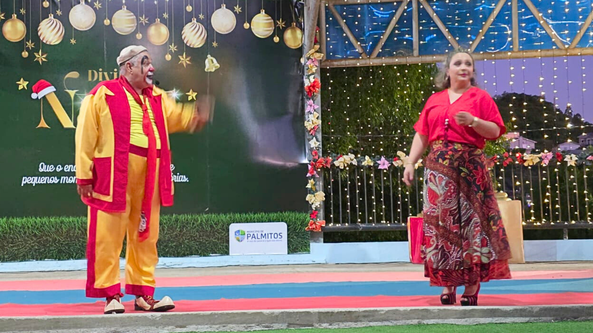 A Praça de Palmitos se transformou em um verdadeiro cenário de encantamento durante a programação do “Divino Natal”. O evento, que vem movimentando a cidade durante toda a semana com orquestras e apresentações de patinação, teve como destaque nesta sexta-feira a alegria do Teatro Biriba e a presença massiva das famílias palmitenses.